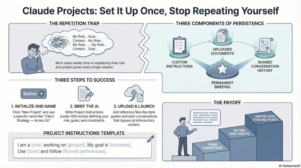 Projects is a feature inside Claude.ai that gives Claude a persistent context for a specific area of your work. Set it up once and every conversation inside that Project starts already knowing who you are and what you need.